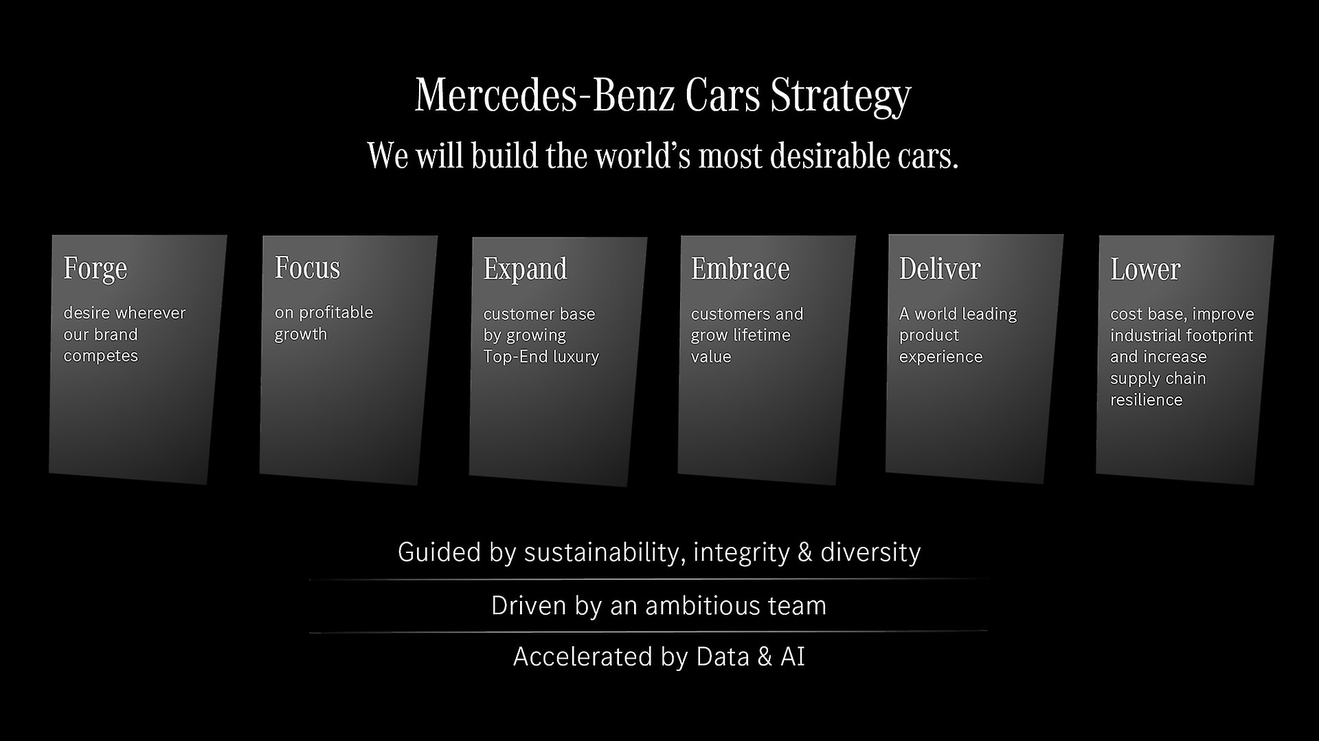 Mercedes-Benz Cars’ goal is to build the world’s most desirable cars. The division aligns its actions in pursuit of this goal with six strategic pillars.