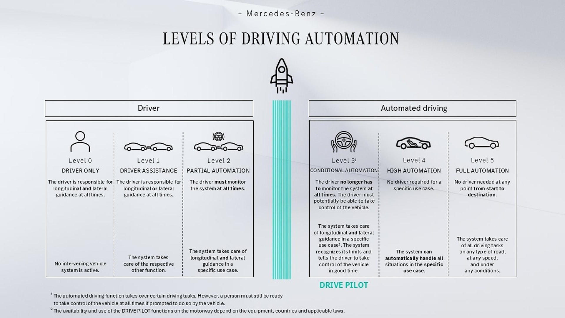 For Mercedes-Benz as a manufacturer, vehicles taking over the task of driving means the following: The implementation of traffic regulations is part of the system design. For this purpose, the road traffic regulations are translated into requirements for the software. Experts from the fields of development, law, ethics, product safety and certification work together on an interdisciplinary basis from the outset and consider technical, legal, regulatory and ethical aspects in equal measure. Their aim is to develop safe and reliable automated systems for all road users.