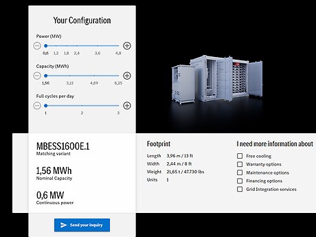 Mit dem Mercedes-Benz Energiespeichersystem (BESS) kann überschüssige Energie aus erneuerbaren Ressourcen öffentlicher Stromnetze effizient gespeichert und genau dann genutzt werden, wenn sie benötigt wird. So wird nicht nur eine stabile Energieversorgung gewährleistet, sondern auch die CO₂-Bilanz der Produktionsstandorte verbessert.