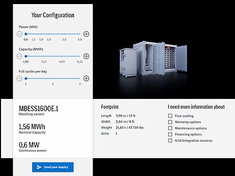 Das BESS nutzt hochwertige Batteriemodule aus dem Fahrzeugbereich zur effizienten Speicherung von elektrischer Energie. Das vollintegrierte Standardsystem kann in 13 Fuß-Containern skaliert werden und enthält sowohl die Batteriespeichereinheit (DC), als auch die Leistungselektronik (AC). Es kann von 600 kW Leistung und rund 1,6 MWh Kapazität skaliert werden, was flexible Lösungen für unterschiedliche Anwendungen ermöglicht.
